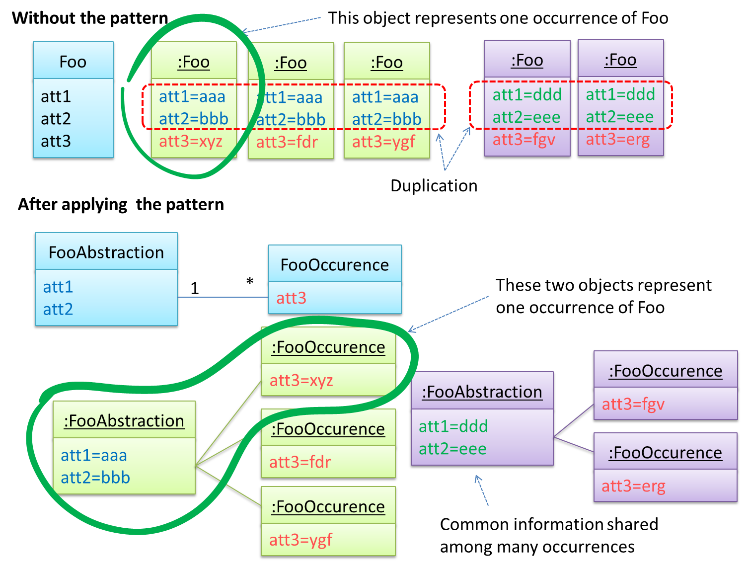 Before applying the pattern, some attributes have the same values for multiple objects. For example, w.r.t. the BookTitle-BookCopy example given in this handout, values of attributes such as book_title, ISBN are exactly the same for copies of the same book.