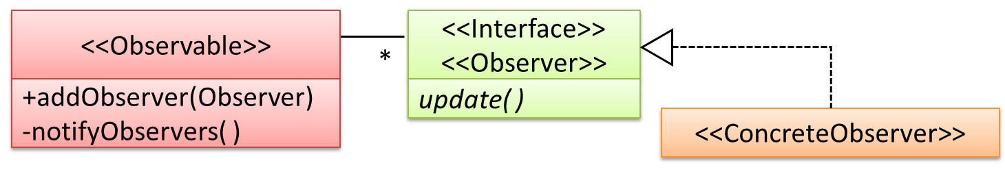<< Observer >> is an interface: any class that implements it can observe an << Observable >>. Any number of << Observer >> objects can observe (i.e. listen to changes
