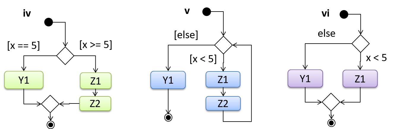 A branch node shows the start of alternate paths. Each control flow exiting a branch node has a guard condition : a boolean condition that should be true for execution to take that path. Only one of the guard condition can be true at any time.