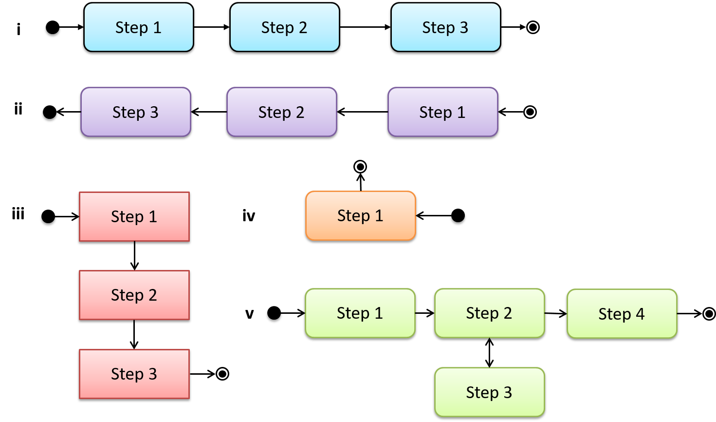 i.e. apply step 1 → [diagram 1] → apply step 2 on diagarm 1 → [diagarm 2] and so on.
