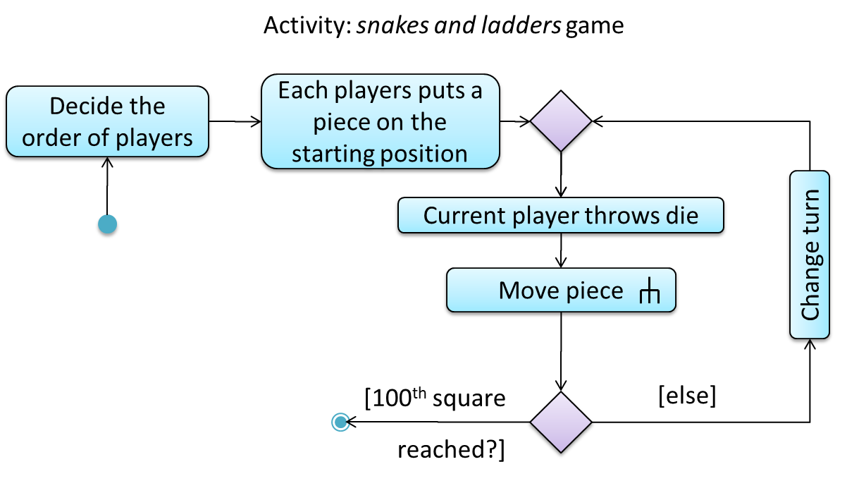 The rake symbol (in the Move piece action above) is used to show that the action is described in another subsidiary activity diagram elsewhere. That diagram is given below.