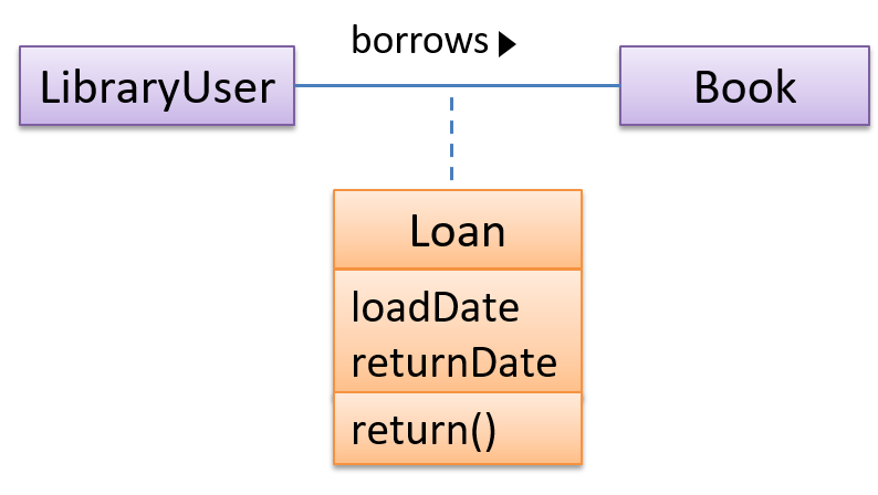 In this example Loan is an association class because it stores information about the borrows association between the User and the