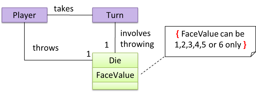 A constraint can be given inside a note, within curly braces. Natural language or a formal notation such as OCL (Object Constraint Language) may be used to specify constraints.