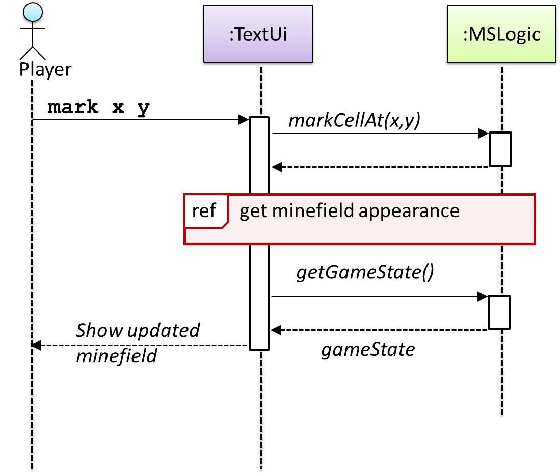 The player runs the newgame action on the TextUi object which results in the TextUi showing the minefield to the player. Then, the player runs the clear x y command; in response, the